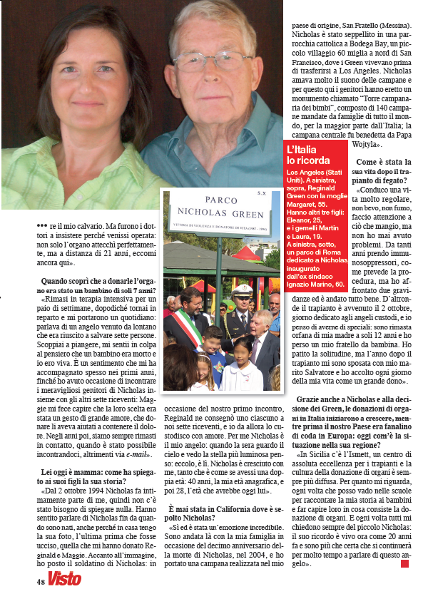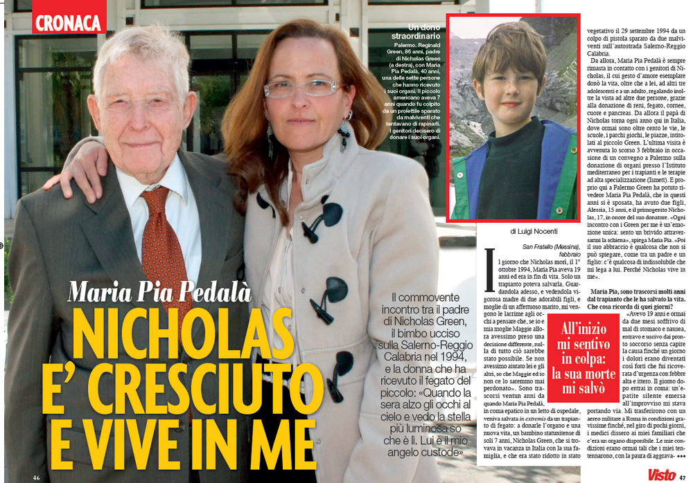 “The day Nicholas died, October 1st 1994, Maria Pia was only 19 years old and she was dying. Only a transplant could save her. Looking at her now, a vigorous mother of two lovely children and wife to a loving husband, tears come to my eyes thinking that, if my wife Maggie and I had made a different decision that day, nothing of this would be possible. If we hadn’t helped her and the others, I know we would never have forgiven ourselves”. Twentyone years have passed since Maria Pia Pedalà, in her final hepatic coma in a hospital bed, was saved at the very last moment by a liver transplant: the donor of the organ and of a new life was an American child, Nicholas Green, only seven years old, who was vacationing with his family in Italy and was declared brain dead after having been shot on September 29 1994 by two robbers along Salerno-Reggio Calabria Highway .