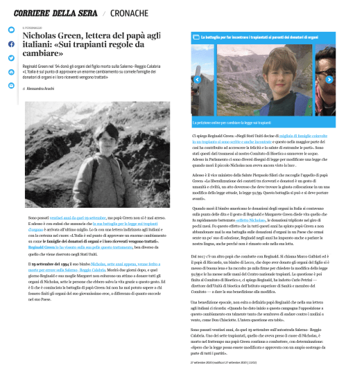 As the 26th anniversary of the shooting death of my small son approaches (Nicholas Green, a seven-year old American boy on holiday in Italy was shot during an attempted robbery on September 29, 1994, died on October 1 and his organs and corneas were donated to seven people, four of them teenagers) Italy is on the verge of making the biggest change in how organ donor families and their recipients are treated since 1999.