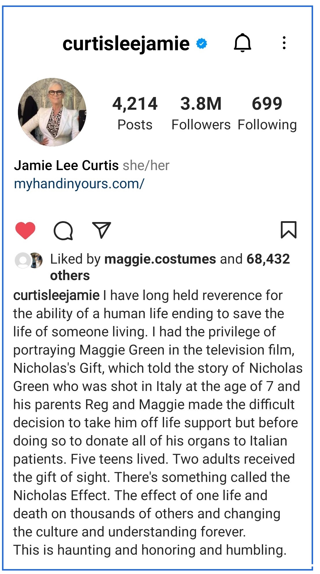Jamie Lee Curtis, who played my wife, Maggie, in an almost forgotten  television movie about organ donation, once told me she was as proud of her performance in it as she was of anything else in her career. This week on her Instagram page she said the subject was  “haunting, honoring and humbling.”