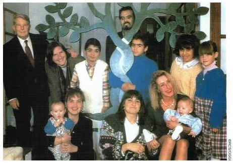 The seven recipients two years after their transplant with the Greens and their three children. Left to right standing: Reg and Maggie Green; Andrea Mongiardo (heart); Francesco Mondello (cornea); Tino Motta (kidney); Anna Maria di Ceglie (kidney); Eleanor Green. Sitting: Laura Green, Maria Pia Pedala (liver), Domenica Galletta (cornea), Silvia Ciampi (pancreas cells), Martin Green. Photo included here by permission of Oggi magazine, Italy