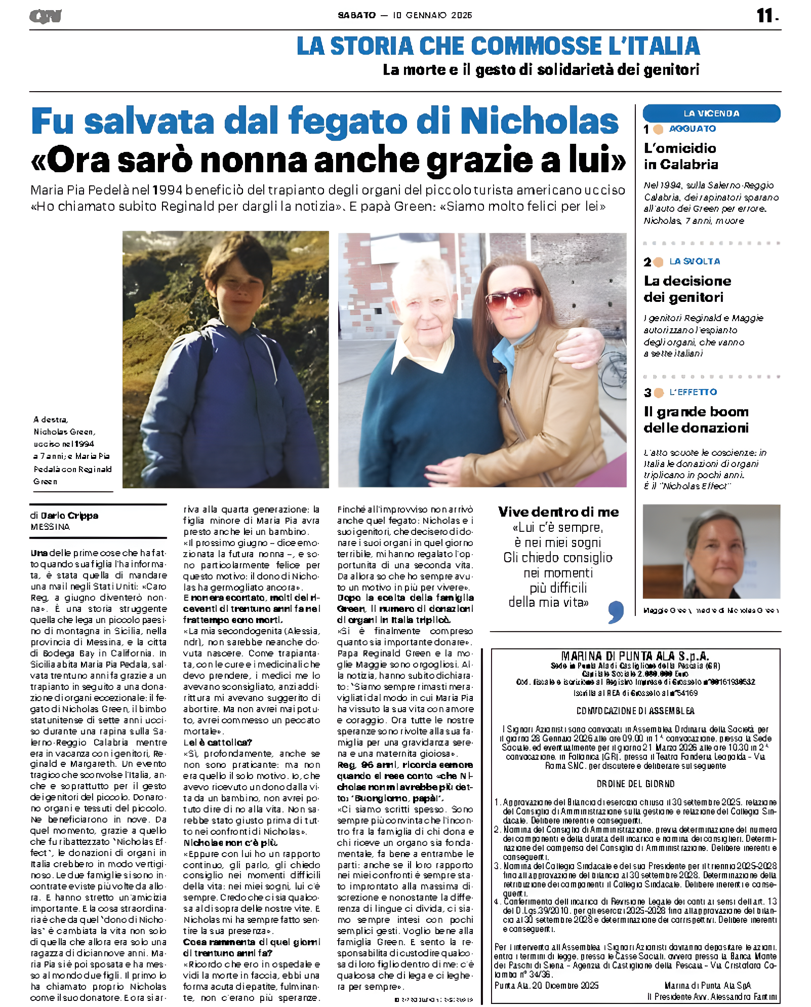 Maria Pia wrote in an email to an Italian friend, Andrea Scarabelli: “I want the Green family to know that the seed of love they planted many years ago continues to grow in the life of our family” She added that as she was writing she was crying with happiness because she never imagined that ‘the great gift’ could give her joy in so many ways.