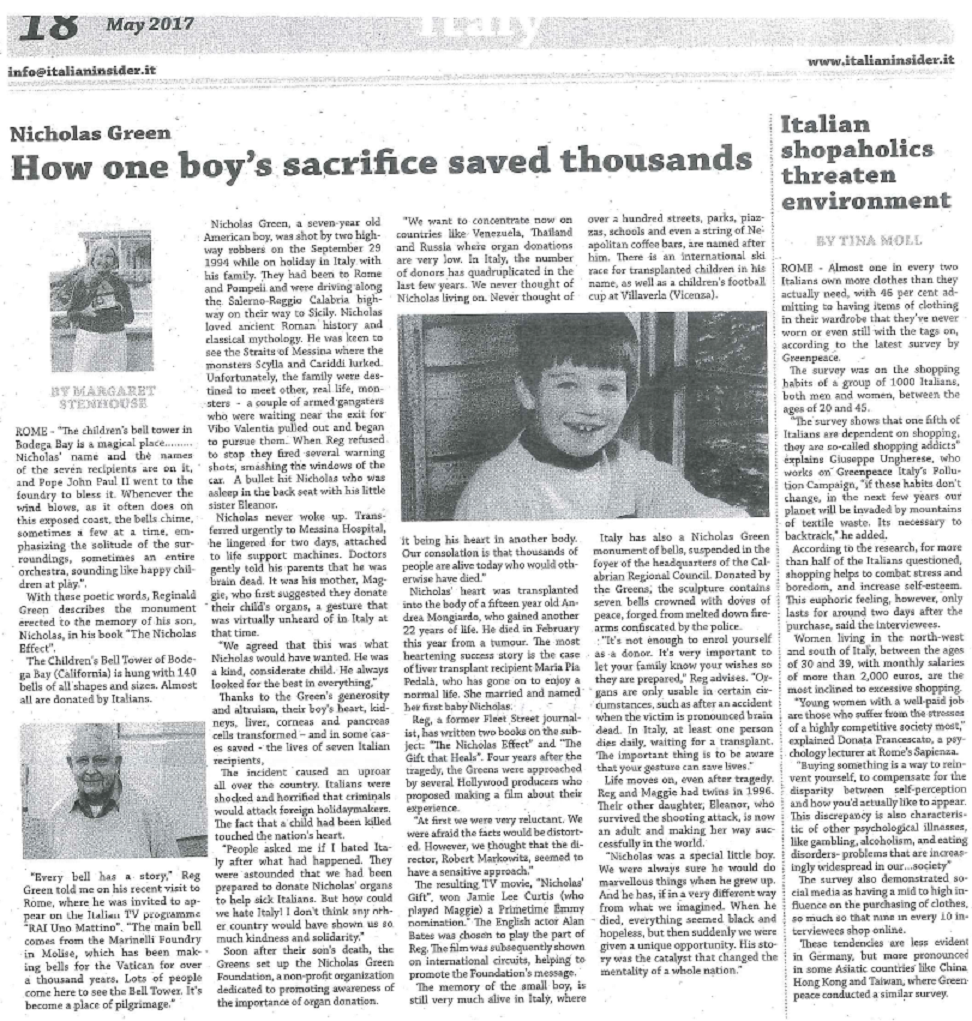 En 2014, un funcionario de Calabria, la región de Italia donde Nicholas fue asesinado, les dijo a los Green en una carta: “Todo el mundo en Italia, y particularmente en Calabria, lleva en el corazón al pequeño Nicholas y el noble ejemplo de bondad, amor y civilidad de su familia“.